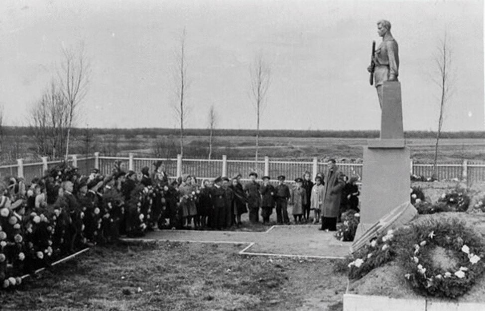 Памятник погибшим появился не сразу. А во время войны несколько военно-полевых госпиталей располагались недалеко от въезда в Невскую Дубровку. Там были и санитарные захоронения, некоторые именные, но в основном безымянные захоронения. Только через одиннадцать лет после окончания войны, в 1956 году, одно из крупных военных захоронений было приведено в порядок и на нём установлен памятник неизвестному солдату. Он был сделан из гипса по инициативе дубровчан и ветеранов. На то время погребёнными здесь, официально признавалось всего 600 человек.
